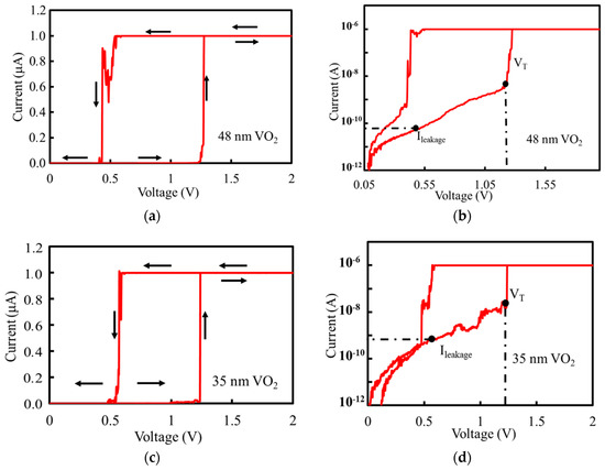 Representative current versus voltage (I-V) measurement results between the Pt AFM probe tip and NP-VO2 on gold. (a) I-V of a 48 nm VO2 particle and (b) the same I-V in log scale clearly showing VT and Ileakage at VT/2. (c) I-V of a 35 nm VO2 particle and (d) its log scale.