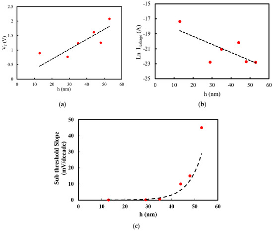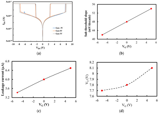 The main charge carriers in VO2 are believed to be electrons [2,15]. It is also assumed that the IMT is triggered by the onset of a critical density of electrons in the channel [2,16]. Thus, one expects the threshold voltage in the MOVFET to become smaller at more positive gate voltages. However, we note that just the opposite is observed in Figure 5c. We also note in Figure 3a that in nano-particles, the transition voltage became smaller in smaller particles. Putting these two observations together, we conclude that the gate electric field in our MOVFET changes the current path between the drain and source, as schematically shown by the white and gray (red) arrows in Figure 4e. When the gate voltage is positive, the conduction path is much wider than when the gate voltage is negative. A negative gate voltage “pushes” the conduction path away from the channel‒gate interface region and confines it to a thinner layer at the top. Thus, the conduction occurs over the smaller channel cross section. The VG dependence of all other parameters (St, Sc and Ileakage) agree with this observation.