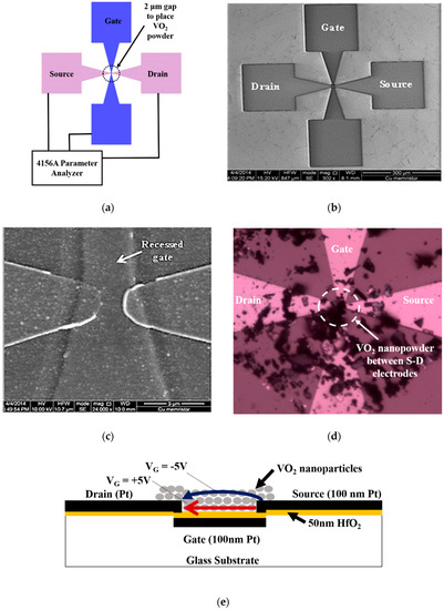 We next incorporated the NP-VO2 in the channel of an FET that were fabricated on a glass substrate with a 100 nm Pt gate covered by a 50 nm atomic layer deposited (ALD) HfO2 dielectric and a 100 nm Pt drain and source electrodes, as shown in Figure 4a,b. The fabrication process is discussed in [14] and was started with etching a 4” glass substrate by immersing it in buffered oxide etch (BOE) for 1 min to create 100 nm deep trenches for the gate metallization regions. After 100 nm Pt gate metal deposition and patterning, 50 nm-thick HfO2 was deposited using atomic layer deposition technique as gate oxide. 100 nm of Pt was then sputter deposited and patterned to create the source-drain regions. Figure 4b,c show the SEM image of the fabricated open-channel FET device.