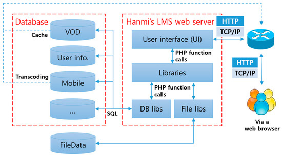 Figure 1 shows the basic structure of the Learning Management System (LMS). Users access the LMS web server using a web browser. The LMS web server provides the VoD (Video on Demand) service according to the user’s request and then allows the user to review and edit his or her information (user info), or provides the mobile web service according to the user environment. Besides, various functions required for online learning, such as notices, Frequently Asked Questions (FAQ), and online textbook purchases, are stored in a database (DB). Meanwhile, the LMS displays information that is useful to the learners, including external data such as weather information and online course news, as well as information provided by the LMS’s own DB.