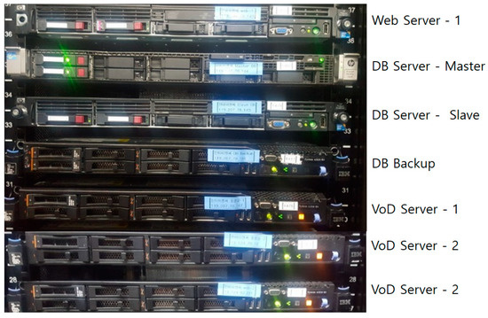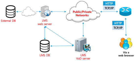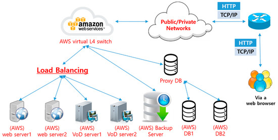 In Figure 3, two web servers and two VoD servers are designed, but each piece of server equipment can be increased to three or more depending on the size of the LMS system. Moreover, since two or more web servers and VoD servers are installed, it can also solve the single point of failure problem. DB 1 and DB 2 are connected to the Internet via a proxy DB, which is a method of coping with equipment failure by duplicating DB 1 and DB 2. By connecting a proxy DB, rather than DB 1 and DB 2, to the Internet, the system can cope with an attack by a malicious user (i.e., a hacker). As shown in Figure 3, it is a robust system that is resistant to security threats, but it has a disadvantage due to the high initial purchase cost of at least ten high network devices. This high initial cost can be reduced by using a web cloud service, as shown below.