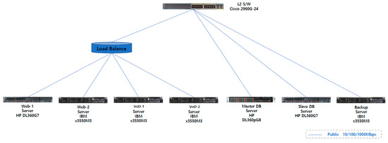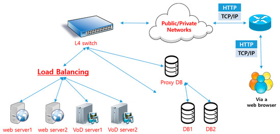 Figure 3 illustrates the proposed network architecture required to solve the problems with the network architecture designed for this study, as shown in Figure 2. The difference in Figure 2 is that the number of web servers, VoD servers, and DBs has increased to 2; and Web server 1, Web server 2, VoD server 1, and VoD server 2 are appropriately distributed by the load balancing function provided by the L4 (Layer 4) switch equipment. In other words, the L4 switch checks the load on the two web servers and the two VoD servers and sends the user’s request message to the server with a lower load.