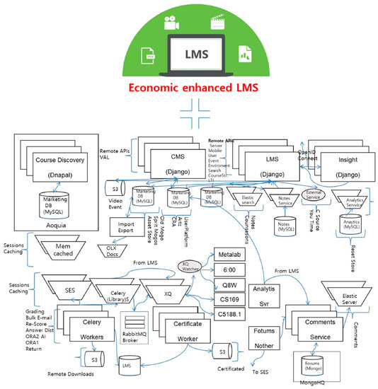 Meanwhile, an LCMS (Learning Content Management System) is a learning object management system that provides a function for managing the learning content uploaded to the LMS. In this regard, management includes the uploading of learning objectives, as well as their modification or deletion. It also provides a function for finding the desired learning object for reuse. In a system where an LCMS is not implemented, file-based content management is performed. A CMS (Content Management System) is a system for managing html on web servers, including tools for creating the html. An CMS system is also applied in various areas with diverse functions, but generally, it is not related to an LMS. LMS functions include content creation and file system uploading of content. As such, it may include some CMS functions [16,17,18,19,20].