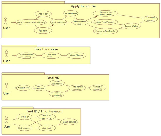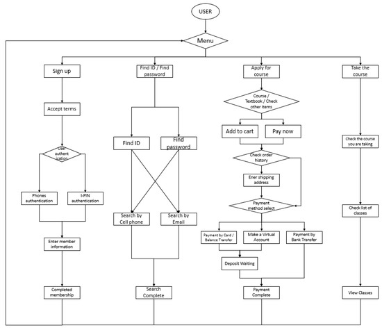 Figure 6 shows the entire operating algorithm of the efficient LMS proposed in this study. The algorithm runs from the user’s perspective and there are four functions in a single menu. The operation will return to the menu once each function has ended. The functions include Membership Registration, ID/Password Search, Register Course, and Take Class.