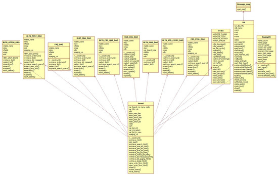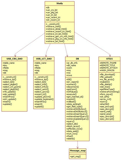 Figure 7 shows a UML class diagram comprised of the following six classes: Study-taking class, ORDER payment class, Board-related class, Player image class, USR_Login class, and PROD related class. Figure 8 shows the UML class diagram.