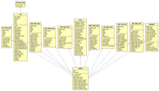 Figure 9 shows the UML_ClassDiagram_ORDER. The main parts of the ORDER payment class are enacted in a 9-part process. First, _construct allocates DB object to common variables. Second, order_ck() checks the number of the product order. If it is an ordered product, it exposes message and process with page move. Third, retrieve_payList() extracts payment detail data and returns payment list to html character string. Fourth, retrieverfdList() extracts refund detail data and returns refund list to html character string. Fifth, retrieve_bskList() extracts shopping bag data and returns shopping bag saved list to html character string. Sixth, retrieve_list_paging() returns paging process data to html character string. Seventh, retrieve_sear ch() returns search layout to html character string. Eighth, retrieve_detail() extracts order detailed data and returns detailed order information to html character string. Finally, retrieve_rfdDetail() extracts detailed refund data and returns detailed information to html character string.