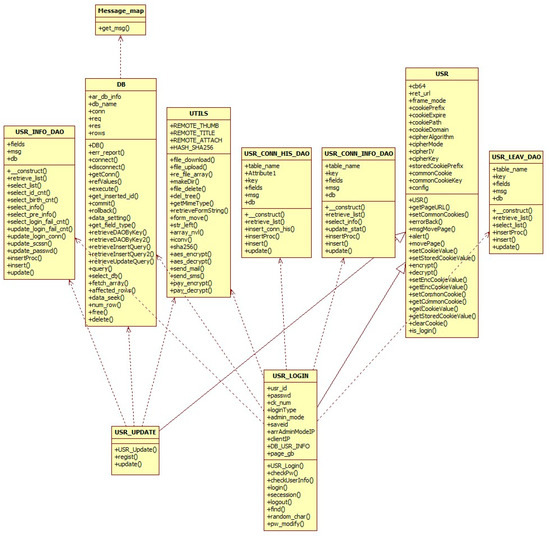 Figure 11 shows UML_ClassDiagram_USR. USR_Login class is divided into eight steps and class. First, USR_Login() initializes common variables. Second, checkPw() extracts member information data and processes error if the input password is incorrect. Third, checkUserInfo() checks password comparison/ID Korean check/ID character string. If there is no problem, and if there is no error message, true is returned. Fourth, login() extracts member information data. It checks data/log-in failure count. If there is a problem, process error is extracted. If there is no problem, it saves member information to the session for log-in and saves log-in history to DB. Fifth, secession() extracts member information data and compares password. If there is no problem, it saves secession information to DB and member information. Sixth, find() extracts member data that fits conditions, performs ID information return, issues a temporary password and sends the temporary password via email or SMS. Seventh, random_char() creates a character string randomly. Lastly, pw_modify() extracts member information data and compares password. If the password is correct, it modifies the password in DB. If not correct, it produces an error message.
