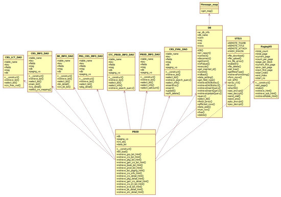 Figure 12 shows UML_ClassDiagram_PROD. PROD class is divided into 14 classes. First, _construct() allocates DB object to common variables. Second, list_load() extracts data and save data into common variables. Third, retreive_grp_list() extracts product classification information data and returns it to html. Fourth, retrieve_pkg_list() extracts package class information list data and returns it to html. Fifth, retrieve_gen_crs_list() extracts class information list data and returns it to html. Sixth, retrieve_book_list() extracts textbook information list data and returns it to html. Seventh, retrieve_prod_list() extracts other product information list data and returns it to html. Eighth, retrieve_list_paging() returns paging process data to html. Ninth, retrieve_pkg_detail() extracts packaging process detailed information data and returns it to html. Tenth, retrieve_gen_crs_detail() extracts course detailed information data and returns it to html. Eleventh, retrieve_crs_lct_list() extracts relevant course information list data and returns it to html. Twelfth, retrieve_eval_list() extracts course review list data and returns it to html. Thirteenth, retrieve_bk_detail() extracts textbook detailed information data and returns it to html. Lastly, retrieve_etc_detail() extracts other product detailed information data and returns it to html.