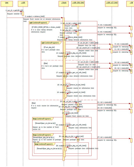 The main parts of the study-taking class are enacted in an 8-part process. First, _construct allocates database objects to common variables. Second, retrieve() extracts study course list or detailed information data and returns it to html. Third, retrieve_detail() extracts detailed class taking information data and returns it to html. Fourth, retrieve_recent_lct() extracts recent take course information data and returns it to html. Fifth, retrieve_lct_list() extracts relevant course class list data and returns it to html. Sixth, retrieve_gen_crs_info() returns detailed general class information to html. Seventh, retrieve_pkg_crs_Info() returns detailed package class information to html. Finally, retrieve_list() extracts study course list data and returns to html.