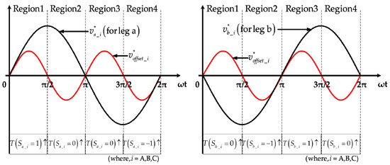 To maintain PWM linearity, the offset voltage can be calculated by differentiating the pole voltage reference vA0* and vB0*, which is described in Equations (3) and (4).