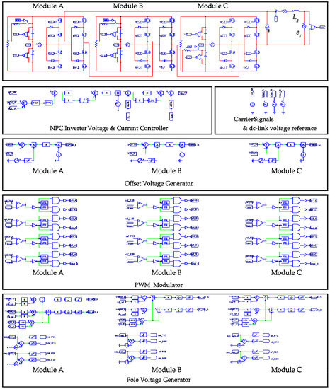 In this paper, the method proposed in [25] was further extended and detailed to adapt to cascaded multi-level inverters. The main concept of this paper is adding the DC-link capacitor voltage error signals of each NPC module into one phase reference signal for balancing each DC-link capacitor voltage error. This paper is organized as follows: In Section 2, an analysis of the offset voltage injection method for the NPC inverter with second harmonic signal injection is provided. In Section 3, a DC-link capacitor voltage balancing method is provided for a multi-module NPC inverter. In Section 4 and Section 5, a 3-kW prototype model is fabricated to verify the effectiveness of the proposed method. Simulations and experiments were carried out under forced DC-link capacitor voltage imbalance conditions. Then, the results of simulations and experiments are discussed. Finally, Section 6 concludes this paper.