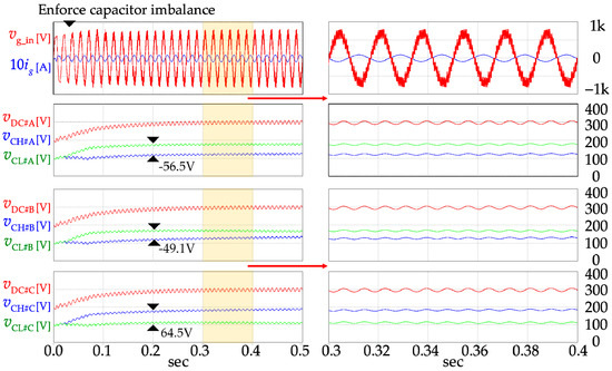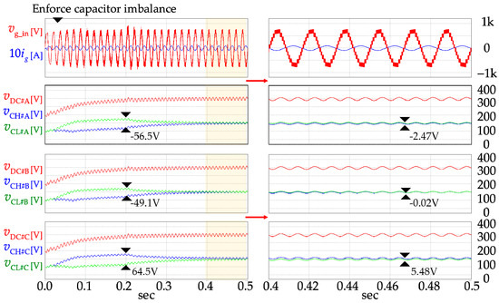 In order to intuitively see the proposed method of each NPC module, an imbalanced condition was forcibly created by using the additional resistive load which connected to each capacitor. The additional resistive load was connected at t = 0.02 s using a switch, and the switch reopened at t = 0.04 s to create a DC-link capacitor voltage imbalance. At this time, the generated voltage differences are −56.5 V in module A, −49.1 V in module B, and 64.5 V in module C, respectively.