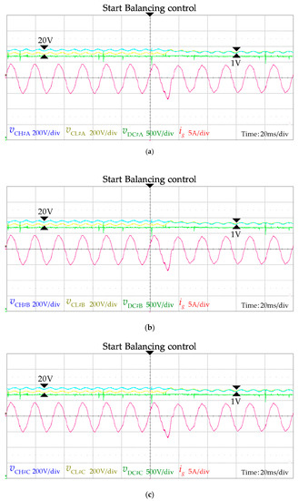 The experimental results of the proposed DC-link capacitor voltage balancing control are shown in Figure 8. Figure 8a–c show the results of applying the proposed method with the imbalance of individual capacitors forced by attaching an additional resistive load to each module. In Figure 8a, there was a capacitor voltage difference of about 20 V between the upper capacitor and the lower capacitor due to the operation of an additional load which connected to the upper capacitor of module A. At this point, the upper capacitor voltage was about 341.7 V and the lower capacitor voltage was about 319.8 V. When the proposed method was applied, the DC-link capacitor voltage difference was reduced to 95% from 20 V to 1 V within about 40 ms. At the start of the balancing control, the input current was slightly distorted, but as the capacitor voltage reached the balancing point, the input current recovered a sinusoidal waveform. In the other modules B and C, the DC-link capacitor voltage was kept constant about 300 V as the DC-link voltage reference, and the capacitor voltages of modules B and C were also maintained constant. In Figure 8b, there were capacitor voltage differences of about 22 V in module A, and 15 V in module B, respectively. In this case, when the proposed balancing control was applied, the DC-link capacitor voltages of each modules were reduced about 95% (100 V to 10 V) in module A, and 87% (15 V to 2 V) in module B. The DC-link voltage of module C was also maintained constant as the above test. Figure 8c shows the results of the proposed balancing method when the voltage imbalance condition has been forced on all modules by using an additional load. As in above experiments, the DC-link voltage differences were reduced about 90% (20 V to 1 V) in module A, and 87% (15 V to 2 V) in module B, and 95% (20 V to 1 V). In case of input current, the input current distortion was small in Figure 8a. However, if the capacitor voltage imbalance condition occurs in each module, the input current distortion tends to increase in the balancing process. This is because the phase voltage reference of each module changes individually due to the injected offset voltage for balancing the capacitor voltage.