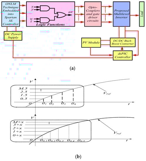 The functional block diagram of the proposed system is shown in Figure 7a To minimize the THD in lower numbers of levels, a new DC offset value of 0.4 was proposed. The reason for choosing 0.4 as the DC offset was illustrated in Figure 7b with a reference waveform. The magnitude of individual harmonics orders is presented on the left side of the Y axis and on the right side, variations of voltage RMS were presented in per unit value. The X-axis was the variation of DC offset which is varied from 0.1 to 0.9. Up to the 15th odd harmonics orders were considered for selection of DC offset value.