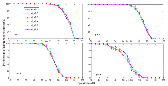 In Figure 2, we compared the reconstruction percentage of different step-sizes of the proposed method with different sparsities in different isometry constants. We set the step size set and the range of sparsity as and , respectively. The isometry constant parameter set was . From Figure 2, we can see that the reconstruction percentage was very close, with almost no difference for all isometry constants . This means that the selection of the isometry constants had almost no effect on the reconstruction percentage of the signal.