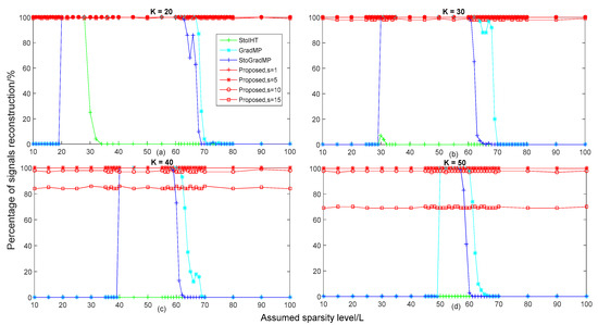 In Figure 5, we compared the reconstruction percentage of different algorithms with different sparsities in different real sparsity conditions. We set the range of the real sparsity of the original signal and the assumed sparsity as and , respectively. From Figure 4, we can see that when the isometry constant was equal to 0.1, the estimated level of sparsity was higher than the other isometry constants. Therefore, we set the isometry constant as 0.1 in the simulation in Figure 5. In Figure 5a,b, we can see that the proposed method had a higher reconstruction percentage than other algorithms when the real sparsity was equal to 20 and 30, almost all of them reached 100%. In Figure 5a, for real sparsity , we can see that when the assumed sparsity , the reconstruction percentage of the StoIHT, GradMP and StoGradMP algorithms was 0%, that is to say, these algorithms could not complete the signal recovery. When , all recovery methods almost achieved a higher reconstruction percentage. When , the reconstruction percentage of the StoIHT algorithm began to decline from approximately 100% to 0%, while the other algorithms still had a higher reconstruction percentage. When , the reconstruction percentage of the StoIHT algorithm was 0%. For , the reconstruction percentage of the GradMP and StoGradMP algorithms began to decline from approximately 100% to 0%. Moreover, the reconstruction percentage of the GradMP algorithm was higher than the StoGradMP algorithm in the variation range of this sparsity. In Figure 5b, we can see that the reconstruction percentage of the StoIHT algorithm was still 0% for all assumed sparsity. When , the reconstruction percentage of the GradMP and StoGradMP algorithms was equal to 0%, while the proposed method had a higher reconstruction percentage and was approximately 100%. For , the reconstruction percentage of all recovery methods was approximately equal to 100%. When , the reconstruction percentage of the StoGradMP algorithm began to decline from approximately 99% to 1%, while the GradMP algorithm still had a higher reconstruction percentage. In Figure 5c,d, we can see that the reconstruction percentage of the proposed method with decreased from approximately 99% to 84% and 69%, respectively. Furthermore, from all of the sub-figures in Figure 5, we can see that when the assumed sparsity was close to the real sparsity, the reconstruction percentage of the GradMP and StoGradMP algorithms were very close, with almost no difference. In addition, when the real sparsity of the original signal gradually increased, the range of sparsity that maintained a higher reconstruction percentage became smaller. This means that the GradMP and StoGradMP algorithms were more sensitive to larger real sparsity.