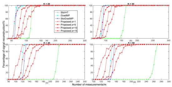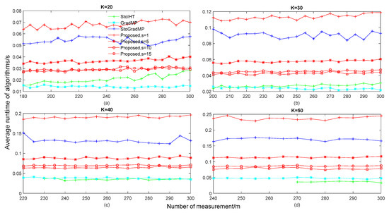 In Figure 8, we compared the average runtime of different algorithms with different measurements in different real sparsity conditions. From Figure 6, for the different sparsity levels, we can see that all algorithms could achieve 100% reconstruction when the number of measurements was greater than 180, 200, 220 and 240, respectively, except for the StoIHT algorithm. Therefore, we set the range of measurements as , ,, and in Figure 8a–d, respectively. In particular, in Figure 6c,d, we can see that the reconstruction percentage was 100% when the number of measurements of the StoIHT algorithm was greater than 230 and 270, respectively. Therefore, we set the range of measurements as and in the simulation of Figure 8c,d, respectively.