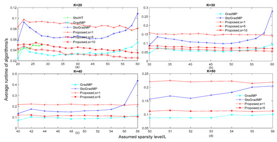 In Figure 7, we compared the average runtime of different algorithms with different sparsities. From Figure 5a, we can see that the reconstruction percentage was 100% for the StoIHT algorithm with sparsity and the real sparsity of and for the GradMP, StoGradMP and the proposed method with with . Therefore, we set the range of the assumed sparsity as and in Figure 7a, respectively. From Figure 7a, we can see that the average runtime of the proposed algorithm with was less than the StoGradMP algorithm, except for the proposed method .