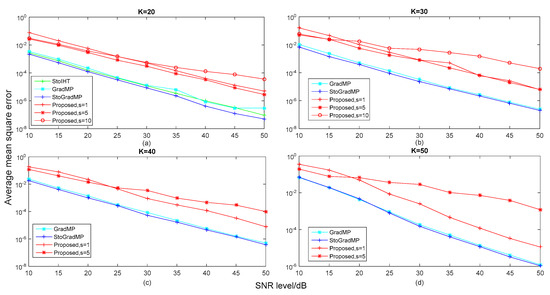 In Figure 9, we compared the average mean square error of different algorithms with different levels in different real sparsity conditions to better analyze the reconstruction performance of the different algorithms when the original sparse signal was corrupted with different levels of noise. We set the range of the noise signal level as in simulation of Figure 9. Furthermore, to better analyze the reconstruction performance of all reconstruction algorithms in different real sparsity levels conditions, we set the real sparsity level as 20, 30, 40 and 50, respectively. Here, the noise signal was a Gaussian white noise signal. In particular, all of the experimental parameters were consistent with Figure 5. In Figure 5a,b, the reconstruction percentage of the proposed method was 100% with a step-size of . Therefore, we set the size of as 1, 5 and 10 in the simulation of Figure 9a,b, respectively. In Figure 5c,d, the reconstruction percentage of the proposed method was 100% with a step-size of . Thus, we set the size of the step-size of the proposed method as 1 and 5 in Figure 9c,d, respectively.