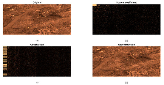 In Figure 10, we test the application efficiency of our proposed method in remote sensing image compressing and reconstructing. The Figure 10a–d show the original remote sensing image, its sparse coefficient, compressed image(observation signal) and reconstructed image by our proposed method. By comparing the Figure 11a with Figure 10d, we can see that our proposed method reconstructs the compressed remote sensing image successfully.
