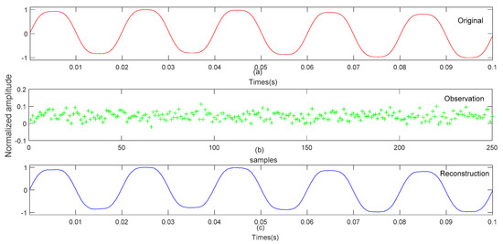 In Figure 11, we test the efficiency of our proposed method in application of power quality signal compressing and reconstruction. The Figure 11a–c show the inter-harmonic signal, compressed signal (observation signal) and reconstructed inter-harmonic signal by our proposed method respectively. It can be seen from Figure 11a,c that the waveforms of two figures are basically the same. This proves that our proposed method is efficiency for inter-harmonic reconstruction.