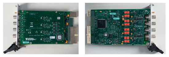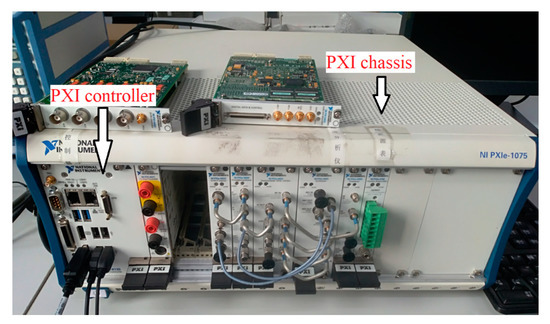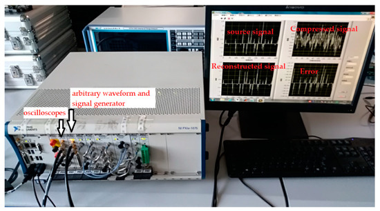 We also used the National Instruments PXI (peripheral component interconnect extensions for instrumentation) system to test the efficiency of our proposed method in application. The hardware of the PXI system includes an arbitrary waveform and signal generator and oscilloscopes. The hardware architecture of arbitrary waveform and signal generator is shown in Figure 12. The hardware architecture of oscilloscopes is shown in Figure 13. Figure 14 shows the PXI chassis and controller, which are used to control the arbitrary waveform and signal generator and oscilloscopes. We insert the arbitrary waveform and signal generator and oscilloscopes into PXI chassis to construct the complete measurement device. As is shown in Figure 15. Mixed programming of Labview and MATLAB were used to realize the compressed and reconstructed algorithm. From the experimental results, it can be seen that the proposed method successfully reconstructed the source signal from the compressed signal.