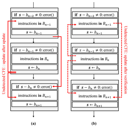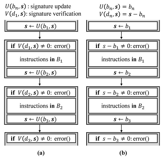 In the literature, many CFE monitoring schemes have been introduced in order to mitigate system failures due to CFE. Signature-based CFE monitoring is a typical software-based CFE monitoring scheme. Figure 2a shows the basic model of the existing signature-based CFE monitoring scheme, which consists of two routines: signature update U(, s) and signature verification V(s, ). represents the basic block; represents the signature variable in and is determined at compile time; s is a signature variable and is updated during runtime; and is a signature determined with = U(, s) at compile time and it is used for comparison with the run-time signature s. The run-time signature s in is updated with signature update and it is verified with signature verification in the next basic block . If V(s, ) does not meet zero, the CFE monitor judges that CFE has occurred. As the simplest case of a signature-based CFE monitoring scheme, U(, s) = and V(s, ) = s − = s − can be selected, as shown in Figure 2b.
