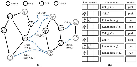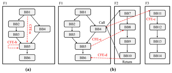 The SSCFM scheme detects CFE in the coverage of inter-procedural control flow. CFE detection within each function could be one of the factors that degrades the CFE detection performance. Figure 6a illustrates how the SSCFM generates an inter-procedural CFG from each CFG of a function and a function .