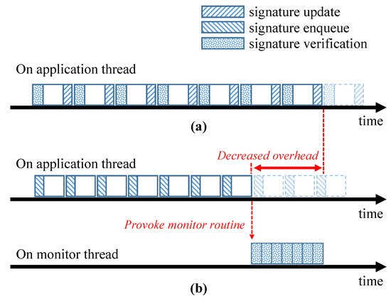 The previously proposed non-SSCFM schemes tightly combine a target application with the CFE monitoring code on a single thread. This makes it difficult to take advantage of multi-core environments and environments. Hence, it is necessary to separate the tightly combined CFE-detectable application into more than two independent routines. The proposed SSCFM scheme treats the signature update and the signature verification as separate routines. Figure 4 describes the typical model of the non-SSCFM scheme and the proposed SSCFM scheme. In the non-SSCFM scheme, the signature update and signature verification are alternately executed in each basic block. However, in the proposed SSCFM scheme, the two routines perform separately on the thread level. The signature update, which is called “signature enqueue” in the SSCFM scheme, is executed in the “application thread” on which the monitored application runs. The signature verification is executed in a separately generated thread for verification. Hereafter, we will call the separate thread for signature verification the “monitor thread”.