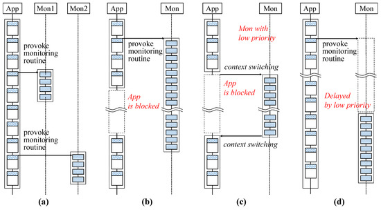 Figure 7c shows a case of an SSCFM-applied application with blocking I/O in an environment in which there is only a single core, or where only one core can be occupied (, B = True). Even if the application is blocked due to I/O, the monitor thread can be context-switched to keep operating. Of course, there is no guarantee that the monitor thread will always run at that time according to the scheduling policy. However, since the non-SSCFM scheme is based on a single thread, it is impossible to do so.