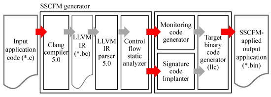 The SSCFM generator adopts an LLVM complier infrastructure [28] and LLVM IR in order to analyze a target application. Clang, a well-known module in the LLVM complier infrastructure, converts the C/C++ code into LLVM IR. The LLVM parser provides a basic block-based data structure to facilitate the basic block-level static analysis.