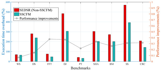 Figure 9 shows the execution time overhead for both the proposed SSCFM scheme and SEDSR scheme when they were applied to each benchmark. Compared with SEDSR, the execution time overhead with the proposed SSCFM scheme was reduced by 6.79%, 14.71%, 37.67%, 36.88%, 22.01%, 33.34%, 26.00%, 31.06%, and 31.55% of performance improvements for WS, DS, FFT, DJ, PT, SHA, BM, SS, and CRC, respectively. The average execution time overhead was approximately 26.67%. This performance improvement in execution time overhead reduction came from both multi-core and multi-threading techniques.
