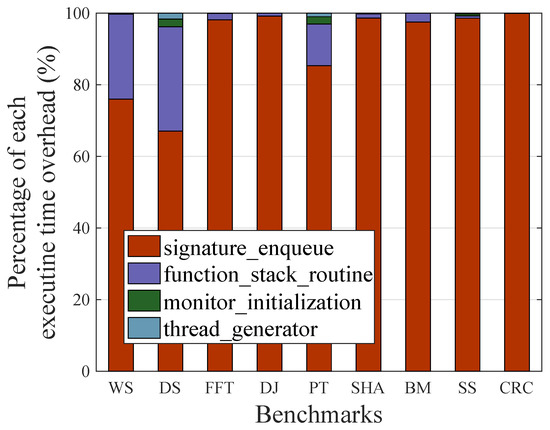We analyzed how the execution time overhead was reduced compared to the non-SSCFM schemes. Figure 10 describes the percentage of execution time overhead for four monitoring routines: signature enqueue, function stack routine, monitor initialization, and thread generator. The average executive time overheads were 91.126%, 7.932%, 0.577%, and 0.368% for signature enqueue, function stack routine, monitor initialization, and thread generator, respectively. In the SSCFM scheme, signature update is replaced by signature enqueue, and there are additional routines, such as function stack routine, monitor initialization, and thread generator. However, with the exception of signature enqueue, the total execution time overhead only took 8.87% on average. Given that no execution time overhead is required for signature verification in the SSCFM scheme, this naturally led to an overall reduction in execution time overhead therein.