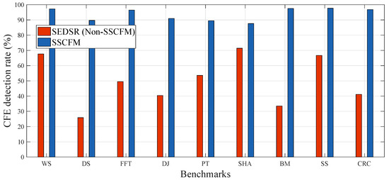 Figure 11 shows the CFE detection rate with the proposed SSCFM scheme and SEDSR scheme applied to each benchmark. The average CFE detection rate of SEDSR was approximately 49.97%. The undetected case of CFEs in SEDSR scheme was caused by the shared characteristics of run-time signature, as noted in Section 3.2. The multi-staged signature update or signature verification proposed in the non-SSCFM schemes could solve this problem, but this approach increased the execution time overhead. The SSCFM scheme solved the problem with the signature queue, improving the CFE detection rate to 91.18%, 89.67%, 96.45%, 90.96%, 89.44%, 87.60%, 97.52%, 97.63%, and 96.77% for WS, DS, FFT, DJ, PT, SHA, BM, SS, and CRC, respectively, without increasing execution time overhead. The average CFE detection rate of SSCFM was approximately 93.69%.
