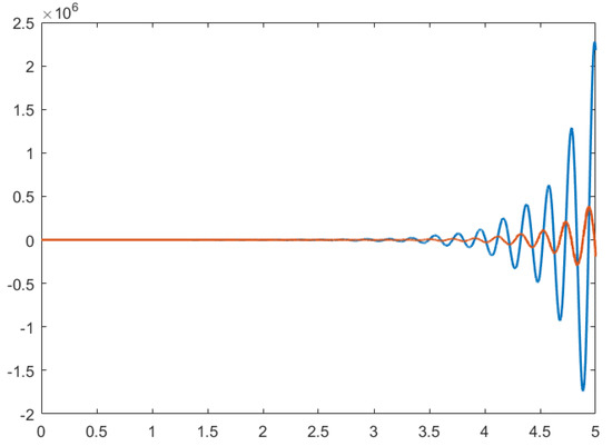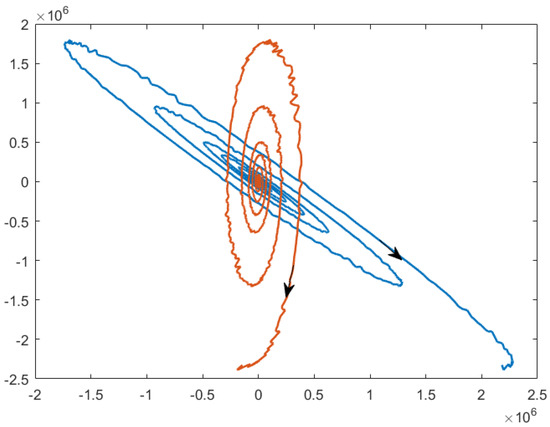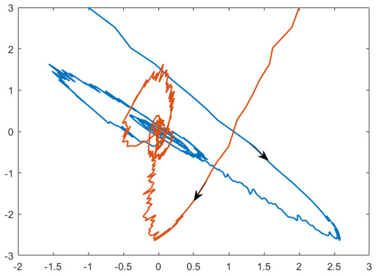 The simulations show that the state trajectories for the open-loop systems without the controller are divergent from Figure 2 and Figure 3, no matter how the initial conditions are taken. That means the energy-storing electrical circuit with time delay and stochastic disturbance is not SFTS according to the terms of Definition 2, which is also illustrated by the phase planes in Figure 4 and Figure 5.