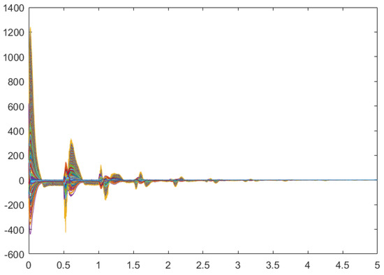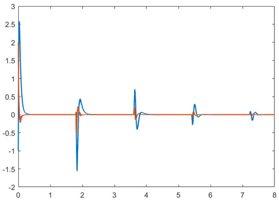 In fact, the control gain matrices in the controller play different roles in ensuring the stochastic finite-time stability of System (6), where K is used to keep the Lyapunov–Krasovskii stability of (6). Furthermore, the convergence of finite-time stability of (6) to zero is determined by . Finally, the influence of time-delay term on the systems is eliminated by .