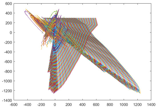 The state trajectories of open-loop systems with 100 different initial conditions (, ).