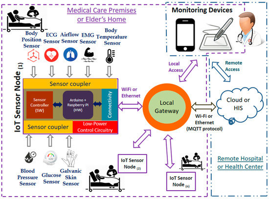 The IoT Sensor Node, developed in this work, is applicable to an e-health monitoring framework like the one in Figure 1, where a patient is monitored either in a hospital or a rehabilitation center. Orders can be given by a supervising physician for specific medical tests that can be performed by the patient himself or with nurse assistance, while the results are uploaded to a cloud or the Hospital’s Information System (HIS). Qualified staff can examine the results of the medical tests in order to define appropriate treatment or schedule additional tests. The IoT Sensor Node comprises an Arduino UNO Microcontroller and a Raspberry PI platform [13]. A set of medical sensors with either a simple analog or smart digital interface can be attached to the monitored person and they are all connected to the portable IoT Sensor Node (through the sensor coupler). A low power circuitry has been designed and incorporated as power control mechanism. The IoT Sensor Node communicates through the connectivity layer to a Local IoT Gateway which is installed on the premises. The Gateway gives comprehensive instructions to the smart phone or the tablet of the patient under supervision. The Gateway is also used to forward the measured sensor values to a database or cloud which is accessed by the supervising physician or nurse [5]. In the reverse direction, the Gateway accepts a scenario of medical tests that should be performed, translating this scenario into commands that are executed by the Sensor Controller (SC). The SC implements a protocol that is executed on the Raspberry PI processor and supports the communication with the Local Gateway using a wireless infrastructure (e.g., Wi-Fi, Bluetooth). The SC collects data from sensors and transmits them to the Gateway. Slight tasks like alerts regarding temperature, humidity conditions, patient behavior etc. can be directly retrieved via the GW, whereas, of course, the supervising doctor makes the significant conclusions by taking into account the stored medical values. At this point, it should be mentioned that although, as aforementioned, the developed system mainly aims to remote monitor individuals in their own environments, its use for a higher number of persons is not restricted as long as the supervising doctors are able to monitor all the sensor values stored in the cloud (or HIS) and the necessary privacy and security levels are preserved. The local gateway usually transmits its data to the cloud or HIS by employing the Message Queuing Telemetry Transport mechanism (MQTT protocol). The MQTT protocol utilizes publish-subscribe communication over the Transmission Control Protocol (TCP) layer (employing shorter header than typical TCP), and is used for Machine-to-Machine IoT applications, due to its flexibility and scalability [34].