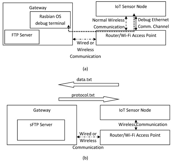 Figure 3 shows the communication paths used between the proposed Internet of Things Sensor Node (IoT SN) and the Gateway when they operate in debug (Figure 3a) and real time mode (Figure 3b). As delineated in Figure 3, a secured FTP (sFTP) server (like FileZilla) has been installed on the Gateway side for the implementation of the Sensor Controller—Gateway communication protocol. This protocol is implemented through two types of files: (a) a command file which is prepared in the Gateway and downloaded by the Sensor Controller describing the sampling strategy and (b) the data file which is used to store the measured sensor values and is uploaded to the Gateway. In real time operation, the IoT SN is connected wirelessly to the Wi-Fi (IEEE 802.11g) router. The Gateway can be also connected in a wired manner to the router since it is not necessarily portable. In debug mode, the IoT SN is both wired and wirelessly connected to the router. The wired connection allows for the debugging of the IoT SN by the Raspbian operating system (OS), or simply by a telnet terminal (like putty) that can be opened at the gateway or a different computer.