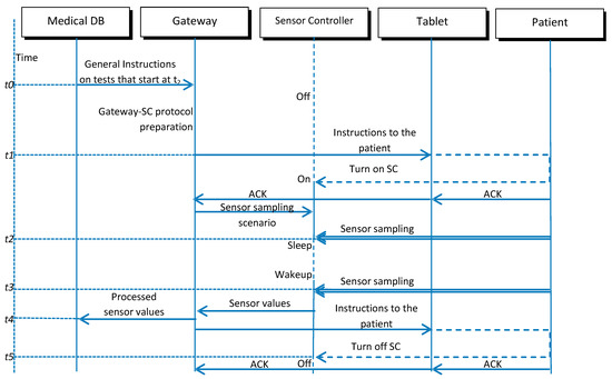 The fundamental communication scheme between the subsystems of the e-health system of Figure 1 is depicted on Figure 4. At some specific time, (t0), the gateway reads the instructions concerning the case of the monitored person. If a set of medical tests is to be performed starting roughly at time t2, the patient is informed by the tablet to get prepared (e.g., wear the sensors) a little earlier (at t1). The instructions shown to the patient by the tablet are defined by the gateway. One of these instructions is to turn on the Sensor Controller, the software program executed on the IoT Sensor Node, and download the (sensors) sampling scenario by the gateway through the developed Sensor Controller-Gateway communication protocol. Acknowledgments (ACK) are exchanged to confirm that the patient has followed the instructions. The medical tests are performed in specific sampling intervals determined by the medical scenario. If these intervals are long enough, the Sensor Controller may enter a low power (sleep) mode to save power. When all of the tests defined in a scenario are completed, the sensor values are returned to the Gateway. Some local processing may be performed before the final values are uploaded to the Medical Database (DB). Meanwhile, the patient is informed that the tests have been successfully completed and he is instructed to turn off the Sensor Controller. Therefore, the communication mechanism of the protocol between the operating Sensor Controller and the Gateway is important for the support of a diversity of sampling strategies and thus, for supporting as many medical cases as possible.