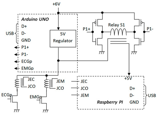 Regarding the relay’s power consumption, it should be mentioned that in order to avoid a constant current flow through the relay S1 (see Figure 5) either when it remains open or closed, the S1 was selected as a pulsed on-off type of relay. These relays change state when current flows for a short time interval to a specific direction. Then, when the current flow stops, it remains in this state until there is a current flow of opposite direction in the relay coil. The specific relay used requires a current of 100 mA for about 150 ms to change state. The current in this relay is controlled by four MOSFETs connected as a pair of CMOS inverters. Two digital pins (P1+, P1−) are used from Arduino for the control of this relay. The current drawn from these pins is negligible since the gate leakage of the MOSFETs is in the order of n A.