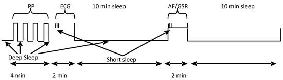In Figure 7, the various sampling and sleep intervals are shown as defined in the case study described earlier. Taking into consideration the power consumption during the normal sampling operation, i.e., the light, deep sleep, and shutdown modes, draft estimation can be performed on the energy consumed during this scenario. Specifically, in the first four minutes when the patient position sensor is sampled 4 times and each time the system goes to 1 min deep sleep mode, we can assume that for 4 × 30 s the power consumed is 1 A (shutdown mode). The power consumed during deep sleep mode is negligible and won’t be considered. The system also enters deep sleep mode after the 2 min interval where ECG is sampled, and after the 2 min interval where the breathing airflow and the galvanic skin conductance sensors are sampled. Thus, the corresponding 1 A power consumption has to also be taken into consideration for an additional 2 × 30 s.