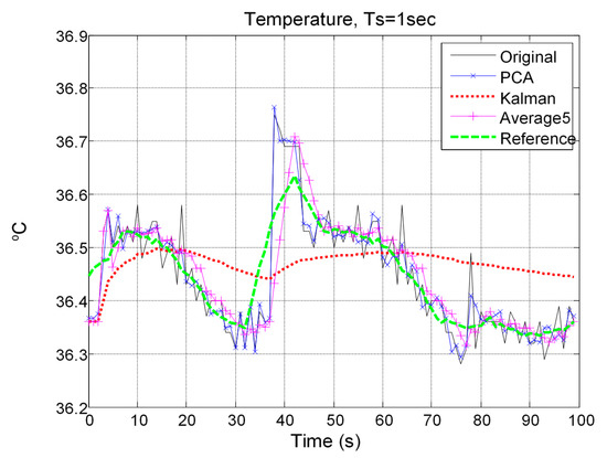 It is deduced from Figure 8 and Figure 9 and Table 1 that the usage of the Moving Window Average filtering algorithm on the original (sensor) values has improved them significantly when compared to the reference measurements. Regarding application of the PCA algorithm, in most cases reduces the error and compresses the signal. Moreover, if a higher compression rate had been selected (with a lower m value) an even lower error would have been achieved in the particular examples where the smoothing is preferable than the preservation of the original signal details. At this point we would like to mention that, to our knowledge, this is one of the few works where PCA is used mainly for noise reduction of biometric signals. Undoubtedly, there exists a plethora of works in the literature where PCA techniques are applied to various biometric sensors (ECG, EEG, EMG etc.), like in [37,38], but their exclusive target in most of these cases was to achieve compression and classification. In the last few years the efficiency of PCA in noise reduction was acknowledged and it has been proposed to be used in applications like noise reduction for Doppler radars [39] and in SNR improvement for Inchoate Faulty Signals [40].