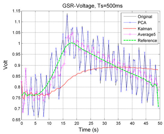 In Figure 8, the temperature sensor values are evaluated against the reference ones as provided by a certified thermometer and the values that are produced after the application of the filtering algorithms described in Section 2.2. The Moving Average Window is applied for k = 5 samples that are initially averaged, and two of these samples are excluded (the ones with the highest deviation from the initial average). The PCA algorithm was applied using m = 3 columns of the n = 10 of the U matrix (compression 30%). The Kalman filter is applied following the exact algorithm described in Section 2.2. The same filtering algorithms and configurations have also been used for the GSR sensor in Figure 9. The Mean Square Error (MSE), the Normalized MSE (NMSE) and the Signal to Noise Ratio (SNR) parameters were mainly used for comparison. The aforementioned parameters are defined for a reference signal vref of N samples and a real signal v according to Equations (14) and (15).