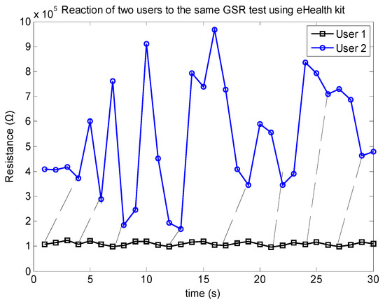 The application of the Kalman filter was not successful since a higher error appears. This error could have been reduced by tuning appropriately the parameters P0 and Rn defined in Section 2.2. However, a different tuning would have been required for different sensors. In Figure 10, a pair of GSR sensors was connected to different users responding to the same stimuli. As shown from this figure, the resistance pattern was quite similar in the two plots in terms of local peaks (minima and maxima), taking into consideration that the User 1 responds about 1 s earlier to the same stimuli than User 2. The dashed lines in Figure 10 show the peak correspondence between User 1 and User 2. However, the absolute resistance values corresponding to the two users and their amplitude are significantly different.