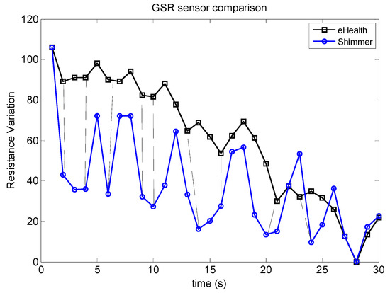 Figure 11, shows the resistance variation of a Libelium e-Health GSR sensor and a Shimmer one, attached to the same user that is subject to a Stroop test. The difference in the absolute values of the two plots should not be taken into consideration. The important issue noticed here is that the patterns are similar and most of their peaks match as shown by the dashed lines. This is an indication that the GSR sensor of the developed e-health system operates reliably.
