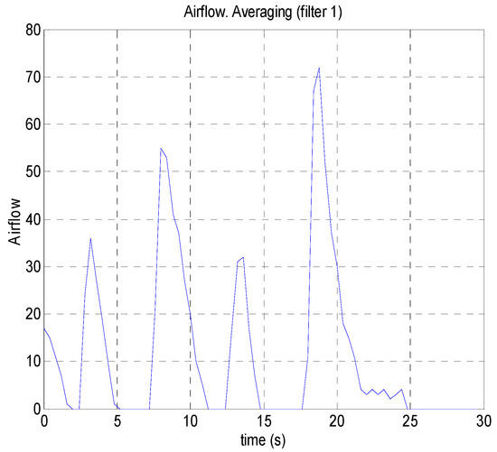 In Figure 12, the airflow sensor of the developed system is tested with a pattern of two deep breaths followed by two moderate ones. The sensor was used without applying filtering (Section 2.2) and as a result of this, additional peaks appear. In Figure 13 and Figure 14, the breathing pattern used is alternately a deep and a moderate breath. A slightly different type of averaging is used in these figures. Filter type 1 depicted on Figure 13 extracts the average by employing three successive samples. Filter type 2 shown in Figure 14 follows the averaging method described in Section 2.2 with 5 initial samples, and rejecting 2 extremes for estimating the final average. As it is derived by these figures, both averaging schemes represent clearly the breathing pattern used. The rippling at the end of the curves is due to the fact that the sensor is removed at that time instant from the user.