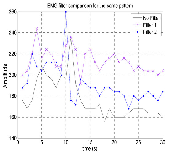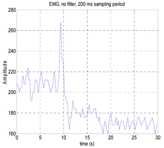 The EMG sensor’s results are shown in Figure 15 and Figure 16. In Figure 15 a relatively small sampling period of 200 ms was used with no filtering. A moderate muscle contraction is followed by a strong and then a small one. Although an intense rippling appears, the muscle contraction pattern is recognizable. The same muscle contraction pattern is used in Figure 16 with a longer sampling interval of 1 s that allows the various filtering types to be applied. The reduced rippling allows the three muscle states to be recognized more clearly when averaging is used and especially when Filter type 2, of Section 2.2, is applied.