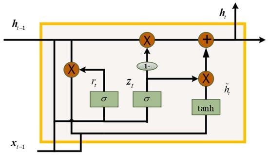 The gated recurrent unit is another popular variant of the common RNN, and was first proposed by Cho in 2004 []. In a GRU, the information flow is also controlled and monitored based on a ‘gate’ structure, however, a GRU has no separate state cells. A GRU basic structure is shown in Figure 2. In the figure, is the hidden state at time , and is the hidden state at time epoch . The relationship between and is as Equation (6):