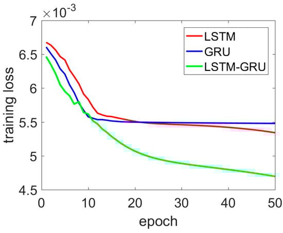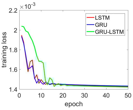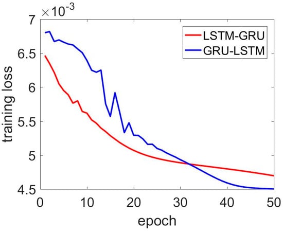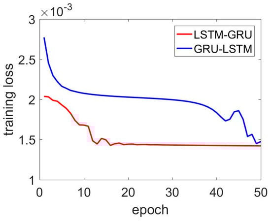 As aforementioned in Section 2.3, there were two different architectures in mixed LSTM and GRU. This section aimed to compare these two architectures in aspects of training loss and prediction accuracy. The date lengths of the training dataset and testing dataset were 1000 and 100,000, respectively. The learning rate was 0.01 for both, the hidden unit was 1, and the training epoch was 50. Figure 6, Figure 7 and Figure 8 present the training loss comparison of the LSTM–GRU and GRU–LSTM in the three-axis MEMS gyroscope de-noising. In addition, training loss means the errors between the predicted values and the real signal values were not included in the training dataset.